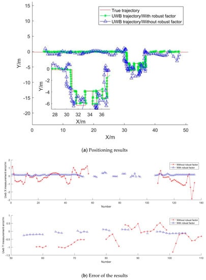 In order to verify the feasibility of the UWB location algorithm proposed, in a scene where the corridor is narrow and long and the UWB anchors are on the same elevation surface, an experimental analysis was made. Two methods for the calculation of the coordinates of the UWB tag are used. One is the least square method, the other introduces the robust factors and ill-conditioned constraint parameters. The results and errors are shown in Figure 8.