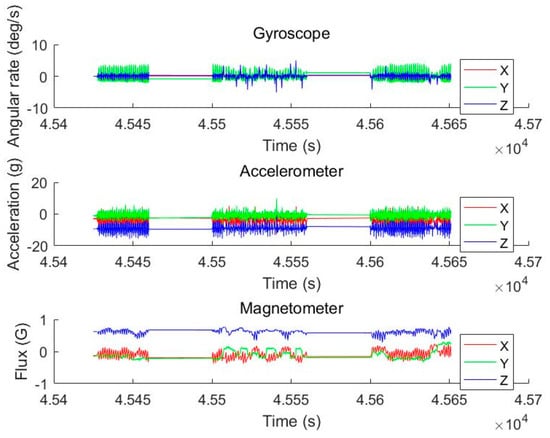 Figure 9 shows the acceleration, angular velocity, and magnetic field intensity data collected by a 9-axis INS device during pedestrian advance in the experiment.