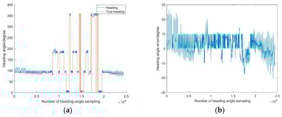 Figure 10 shows the heading angle of the pedestrian calculated by this method (the north direction is the initial reference). As can be seen from the figure, this angle can reflect the direction of the pedestrian. However, in the experiment, the pedestrian walks in a fixed direction and the angle change is small, but the heading angle in the map fluctuates greatly, which indicates that there is a large error; the maximum error is 26.41° and the RMSE is ±6.61°. The dead reckoning method has high requirements for the course angle, so it is necessary to further correct the course angle. For this reason, the heading angle is adjusted by a map constraint. In order to make the positioning error less than the step size, the heading angle cannot exceed 5°. Once the angle is more than 5°, the map heading is used to restrict the heading.
