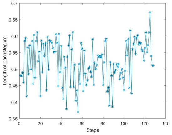 From Figure 11, it can be seen that the acceleration peak and valley of a person can be detected. The maximum acceleration is due to the peak time, and the minimum acceleration is due to the valley time. So the step length can be calculated with Equation (12). The step length is about 0.38~0.68 m and can be seen in Figure 12. The number of steps is 135, which is equal to the true steps. Meanwhile, the total calculated range is about 65 m, which is basically the same distance as the actual walking distance. That is to say, this method can be used to estimate the walking pose of a pedestrian.