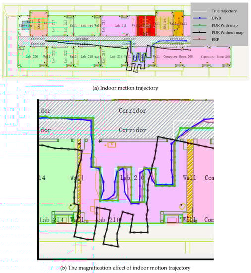 In order to verify the positioning accuracy of this method, two kinds of experimental scenarios are designed. In the first scenario, the whole area of the UWB base station is used. In the other scenario, the UWB signal is out of lock or unavailable for a certain period of time. In both scenarios, the UWB/PDR/Floor Map data are combined to obtain the positioning information.