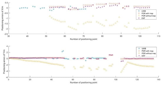 It can be seen that after the UWB is unlocked, the fusion positioning accuracy is still higher than the map-constrained PDR positioning accuracy within 1 ≤ 2 seconds, and then the accuracy will rapidly decline to the map-constrained PDR positioning accuracy. It can be seen that using the positioning method in this paper, after the pedestrian enters the room, the UWB can be used to initialize quickly to obtain the high-precision initial position of the pedestrian. Based on the map information, the possible walking direction of the pedestrian is obtained, and the heading data on the map is used to constrain the pedestrian’s forward direction. Even without the UWB signal, the positioning accuracy can still be maintained. In Figure 15, the RMSE is about ±0.11 m in X direction and about ±0.20 m in Y direction. In Figure 16, the RMSE is about ±0.38 m in Y direction. In the case of the UWB signal, the fusion positioning is recovered quickly, and the higher positioning accuracy is obtained. This positioning scheme, compared with the pure UWB method, can reduce the number of UWB base stations; compared with the PDR positioning method, high-precision pedestrian motion indoor positioning data can be obtained.