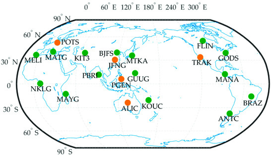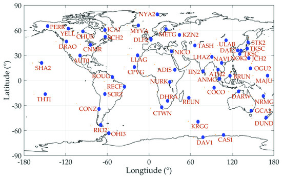 To further verify the quality of current MADOCA real-time products from a practical perspective, PPP experiment was performed using the RTKLIB software developed by Dr. Takasu [29]. GPS observation data of 20 globally distributed IGS stations on 11 November 2018 (DOY 315) were collected for testing with a sampling rate of 30 s. The geographical location of the selected stations for this PPP experiment is shown in Figure 9. In the data processing, the kinematic PPP algorithm provided in the RTKLIB software was applied to process GPS dual-frequency ionospheric-free combination data. To simulate real-time kinematic processing, the forward Kalman filter method was used for PPP validation. The station coordinates provided by the IGS weekly SINEX file (i.e., igs18Pweek.snx) were used as the reference in the positioning error calculations except for the PGEN and MAYG stations. Since there were no precise coordinate messages for these two stations in the IGS SINEX file for the testing periods, the reference coordinates of PGEN and MAYG stations were derived from post-processing of static PPP using IGS final products.