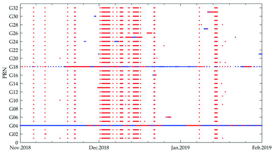 To investigate the availability of MADOCA products, the MADOCA recorded real-time products and the IGS final products were collected from 1 November 2018 to 31 January 2019. The three-month statistic results are presented in Figure 2. The red dots represent the satellite unavailability only in MADOCA real-time products, and the blue dots denote the satellite unavailability in both MADOCA and IGS final products.