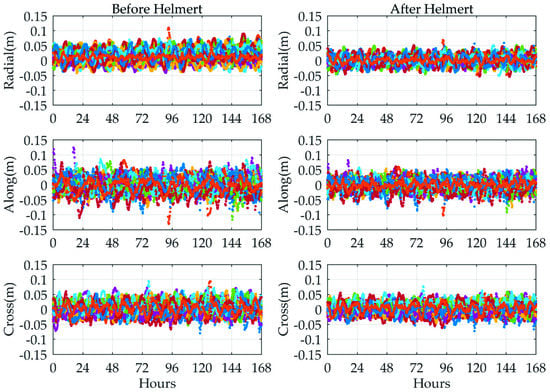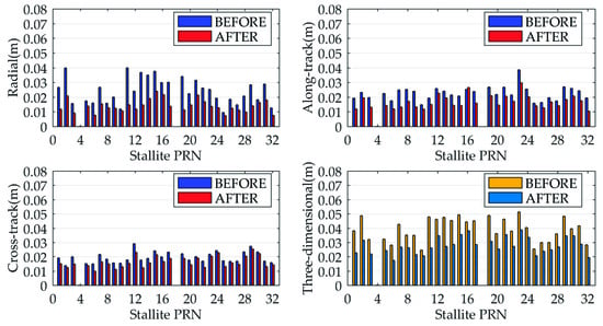 Based on the concepts and algorithms described above, the short-term orbit difference between the MADOCA recorded real-time and IGS final products before and after Helmert transformation was determined from 11 November 2018 to 17 November 2018. The corresponding comparison results are collated in Figure 3. It shows the orbit comparison of all available GPS satellites between the MADOCA and IGS final products in radial and along/cross-track components before and after Helmert transformation. The different color points represent different GPS satellites. To quantify the orbit accuracy of each satellite in three directions, the seven-day RMS for each direction and three-dimensional (3D) RMS values are represented in Figure 4.