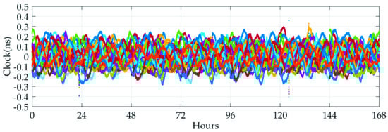 denotes the average of precise-minus-MADOCA clock values of all satellites (i.e., timescale difference), which is calculated epoch-wisely. The variation of average does not affect the positioning results, since the average is the same for all satellites and would be absorbed by the estimable receiver-clock offsets of PPP users at each epoch. The number of satellites is n. and are the precise clock bias and MADOCA clock bias, respectively. Subsequently, the individual clock systematic deviations are corrected by this ensemble average. It is worth noting that in this comparison the gross error caused by the clock outliers or non-existence of the clock-offset values in the raw data is eliminated.