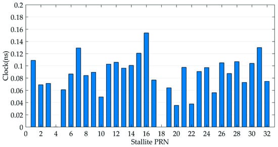 As show in Figure 5 and Figure 6, the various generations of GPS satellites exhibit the better consistency in clock accuracy, which will ultimately be reflected in the respective SISRE budgets. Again, one-day periodical variations are visible for almost all GPS satellites. For each GPS satellite, the averaged-STD value is typically better than 0.16 ns and most of them are at the 0.1 ns level, which confirms that the satellite clocks show a good short-term stability and are capable of achieving the accuracy at cm level in real-time applications.