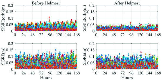 For the purpose of a comprehensive perspective, the orbit-error-only SISRE values and the SISRE values of all available satellites were calculated and the corresponding results are summarized in Figure 7. There are two key messages revealed from this figure. One is that the orbit-error-only SISRE values of all satellites are improved by about 2 to 3 cm after Helmert transformation. The other is that the clock errors contribute an immoderate part of the SISRE budget of almost all GPS satellites. However, the SISRE values are still slightly improved after conducting Helmert transformation. Hence, in the subsequent long-term MADOCA real-time product evaluation, the statistics will be based on the orbit messages after Helmert transformation. As for the SISRE performance, the orbit-error-only SISRE of each satellite achieves a level of 5 cm and the SISRE of each satellite is roughly 10 cm. These results indicate that the MADOCA real-time products achieve JAXA’s goal for real-time orbit and clock accuracy and can meet the centimeter accuracy demands of RTPPP users.