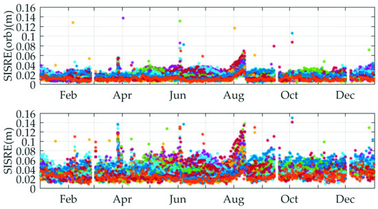 In order to reveal the long-term characteristic of the quality of MADOCA real-time products further, the daily RMS of orbit-error-only SISRE and SISRE values are calculated from the whole year 2018 for all the available GPS satellites. The time series of daily RMS of SISRE are shown in Figure 8.