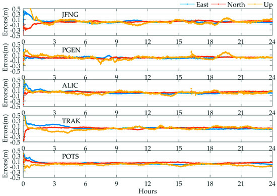 Five of the 20 stations were selected to present the accuracy of positioning errors. Their geographical locations have been marked by orange dots in Figure 9. Figure 10 shows the positioning error of the five stations in which the east, north, and up components are denoted by blue, red, and yellow lines, respectively. As seen from Figure 10, the positioning errors of the five stations vary within ±10 cm in the horizontal components and are stable after the convergence/initialization period. For the up component, the positioning errors exhibit more remarkable fluctuation compared to the horizontal components that can even reach up to 15 cm for some epochs, especially a few jumps at the PGEN station. This phenomenon may be explained by the lower accuracy of the clock products in the corresponding epochs.