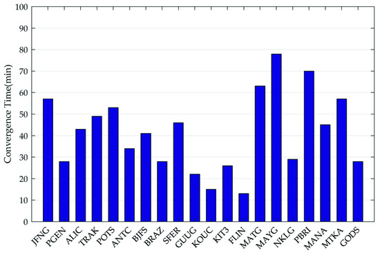 Moreover, the statistics of convergence time for all 20 stations are summarized in Figure 11. We consider the positioning results to be convergent when both horizontal and vertical positioning errors are less than 15 cm over consecutive 20 epochs. From Figure 11, the convergence time of all stations is within 80 min, and the average convergence time is 40 min.