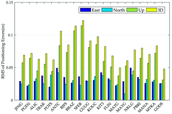 Subsequently, the daily RMS values of positioning errors in the east, north, up, and 3D directions for the 20 stations are calculated and depicted in Figure 12. It should be noted that the positioning results after 360 epochs (with a sampling rate of 30 s) were used for the daily RMS calculation to avoid the influence of convergence/initialization time on the positioning accuracy evaluation. After filter convergence, it is shown in Figure 12 that the real-time kinematic positioning accuracy using MADOCA real-time products is at centimeter level for horizontal direction and 1 decimeter for up direction, which may be attributed to MADOCA real-time 30-s high sampling rate orbit and clock products. The daily RMS values of all selected stations can reach 4.9, 4.2, 11.7, and 12.1 cm in the east, north, up, and 3D directions, respectively. This means that the current MADOCA real-time products can meet the accuracy requirements of the PPP solution and also demonstrate the validity and authenticity of the above-mentioned orbit and clock products evaluation work.