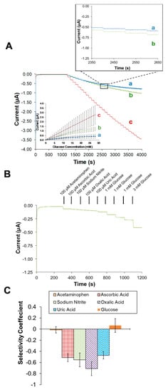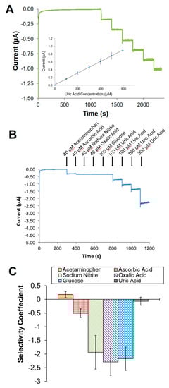 Figure 4B,C) though the different electrode geometry appears to allow for a greater AA interferent response compared to the macroelectrode system—a result suggesting that future research efforts may focus on identifying an appropriate electrochemically-deposited polymer film to exclude that particular species [