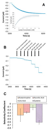 51]. Additionally, the film system maintains effective selectivity toward lactate with nearly negligible responses toward major interferents, including acetaminophen, AA, UA, and cysteine (
