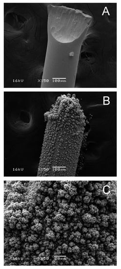 Figure 6 shows SEM imaging of the wire and illustrates the morphology changes accompanying the modification of the wire electrode with Pt-B, a process that both visually and experimentally, as measured with chronocoulometry (