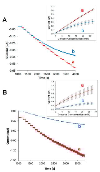Figure 7 illustrates the typical enhancement observed with the addition of the Pt-B under-layer—shown for the glucose model system at a wire. The results clearly indicate a much more substantial, larger current stair-step response is achieved with the use of the Pt-black under-layer—a response that translates into a calibration curve with a substantially higher slope (i.e., higher sensitivity toward glucose). The effect of adding Pt-B under-layer is substantial in every scheme in which it was tested. This robust form of signal enhancement through the use of Pt nanoparticle films was demonstrated on a number of issues, including a uric acid, LbL constructed wire electrode (