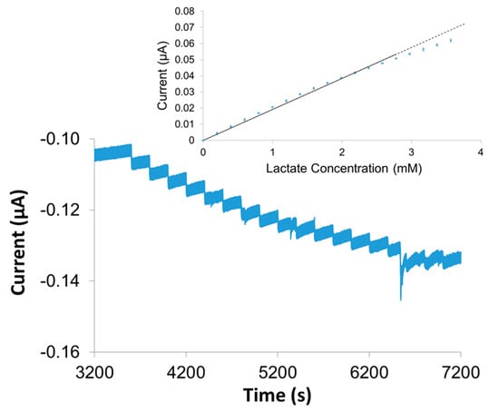 Supplementary Materials, Figure SM-8B). The performance of the lactate sensor is comparable to other reports in the literature describing similar types of electrochemical sensors [
