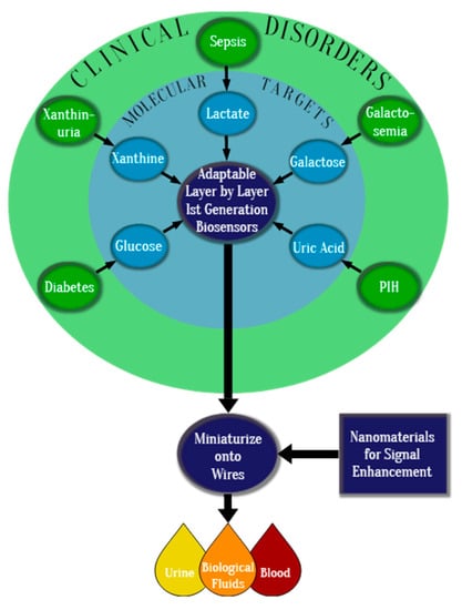 In this work, we explore a general template for the LbL construction of xerogel-based 1st generation amperometric biosensors on needle microelectrodes that are able to target multiple disease-related analytes within the bodily fluids most relevant for the particular disease marker. While some prior work in this area has demonstrated the miniaturization of LbL systems containing enzyme-doped xerogel schemes onto needle-type electrodes [