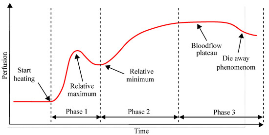 In healthy volunteers, local warming of the upper extremity leads to an increase in local blood flow to a maximum, defined as the blood flow plateau. For patients who are not suffering from vasomotor dysfunction, the blood flow plateau occurs after 30–45 min of continuous warming of the upper extremity [18,19]. The characteristic course of the blood flow over time during uniform warming of the upper extremity is shown schematically in Figure 1. When a warming stimulus is applied on the forearm, the flow velocity of the peripheral blood initially increases to a relative maximum for 2–3 min and then decreases until a relative minimum is reached (Phase 1 in Figure 1). After the relative minimum, the blood flow velocity increases again until it reaches a nearly constant flow velocity (Phase 2 in Figure 1), the so-called blood flow plateau [18,19]. The blood flow plateau characterises the stage of maximum vasodilation and reduced activity of sympathetic nervous system (Phase 3 in Figure 1) [11,12,14]. Furthermore, it has been observed that after prolonged warming of the upper extremity, a phenomenon known as “die away”, occurs (Phase 3 in Figure 1). This phenomenon, in which blood flow slowly returns to its starting point, usually occurs about 45 min after the onset of warming. In this context, it is important to note that in patients with significant vasomotor dysfunction in diabetes or other disease states [20,21], often a lower highest possible vasodilation level is observed, possibly occurring before the expected time of 30–45 min [22,23]. Consequently, in this group of patients, the premature occurrence of a “die away” phenomenon could affect the informative value of the biochemical analysis of a blood sample since the blood flow plateau and its associated favourable physiological conditions would be missed if blood sampling was performed at between 30 and 45 min.