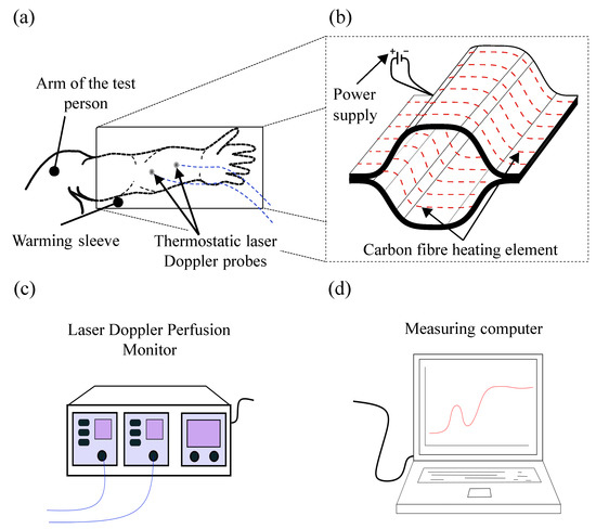 (a) Positioning of the warming sleeve and the measuring probes on the patient’s arm; (b) detailed view of the warming sleeve; (c) data processing; and (d) evaluation of the blood flow curve.