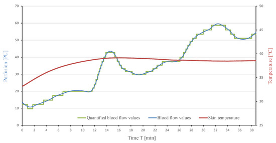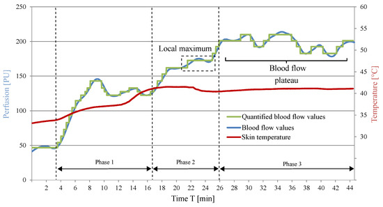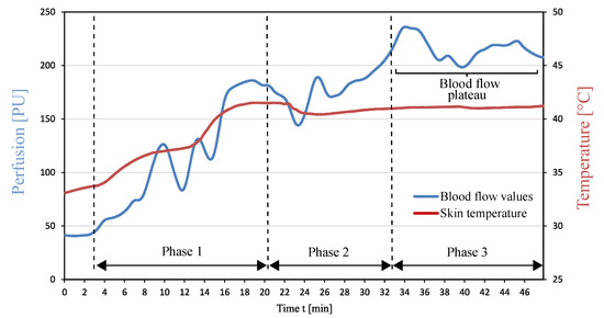In Figure 3, the values of the blood flow measurement and the temperature of the skin surface of a test person are plotted over the measurement period t. The blood flow values in Figure 3 show a clear increase over the measured time period. At the beginning of local warming, the blood flow value is 47 PU. In Phases 1 and 2, more than one relative minimum and maximum were observed, which is due to movement of the forearm and physiological effects. However, as shown in the last section of the diagram, after a warming period of 34 min, the blood flow reached a maximum of 235 PU. In the further course of the measurement, the blood flow averages 210 PU at an approximately constant temperature of the skin surface of 42 C. On the basis of previous blood flow tests, the blood flow values recorded in the time range t = 33 min until the end of the measurement are assigned to the blood flow plateau. The occurrence of this anticipated physiological effect proves the function of the investigated warming concept. At this point, it should be pointed out that the definition of the blood flow plateau does not depend on the occurrence of the die away phenomenon. It can be primarily recognised as a relative steady perfusion after the observation of a relative maximum. The goal of achieving the blood flow plateau is based on the fact that in that time period we have high perfusion for a relative long duration. Since we observed a fourfold increase of the perfusion and achieved these high values for a period of 13 min and based on medical experience, the observed high blood values correspond to the blood flow plateau. This is due to the underlying physiological mechanism, where the observation of the relative maximum is followed from a small increase and then from a steady blood flow.