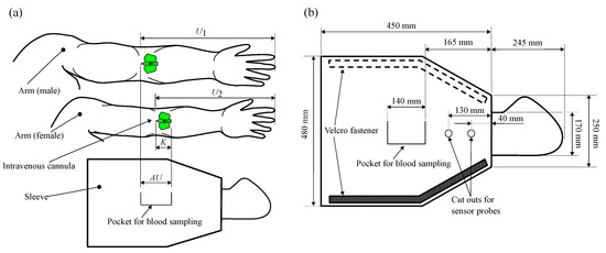 Criterion 1 requires that the prototype of the function-integrative sleeve must cover the entire arm up to the shoulder of the patient. To allow a facile adaptation of the sleeve to the patient’s arm circumference, a sleeve-shaped design was chosen (Criterion 2). To minimise a restriction of finger motion, the sleeve was designed as a mitten in the hand area (Criterion 3). The cut outs for the sensor measuring heads of the LPDM are provided below the mitten at the level of the forearm (Criterion 4). In the area of the arm bend, a pocket with a closure system is provided for retrieving blood samples (Criterion 5). The process of determining all required dimensions is described by defining the length of the pocket required for blood collection based on a literature research on anthropometry [41,42] (Criterion 6). In the further course of designing the sleeve, the measurements referring to the 95th percentile of men were defined as the maximum reference values and the 5th percentile of women to the minimum reference values. The definition of the dimensions and measurements based on these reference values allows a wear-ability for up to 90% of the population. Figure 4a shows the arm of a man whose forearm length refers to the 95th percentile and thus defines the statistical maximum value. The arm shown below represents the arm of a woman whose forearm length lies in the range between the 5th and 50th percentile defining the minimum forearm length. To enable blood sample collection from all test persons whose forearm length lie in the range of (upper limit value) and (lower limit value), the length of the pocket was calculated according to Equation (6),