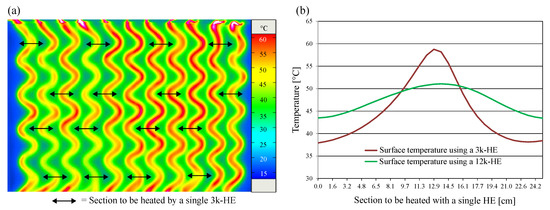 (a) Thermogram of the textile surface of the sample warming system with 3k-HE; and (b) comparison of the experimentally determined surface temperatures using 3k- and 12k-HE.