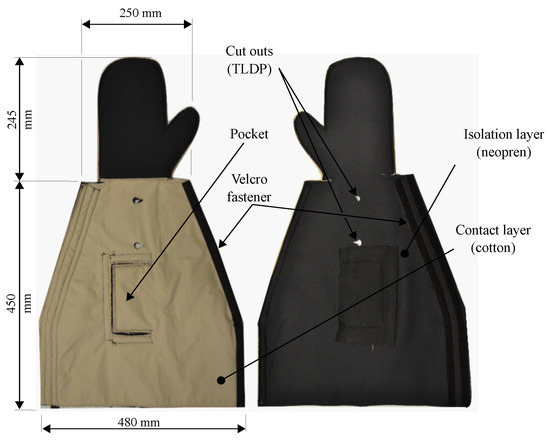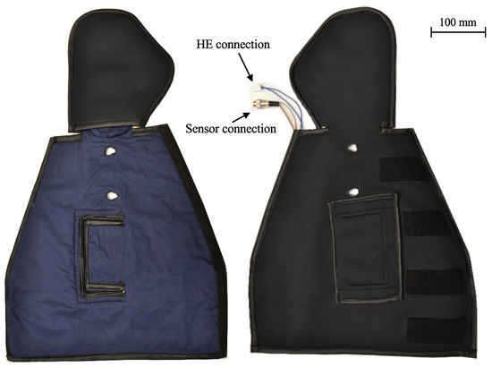 The comprised prototype of a function-integrative sleeve consists of three layers with individual functions and selected materials. The first layer is made out of cotton, shielding the human skin against the direct contact to the functional warming layer. The functional warming layer is made of a heat resistant fleece and works as a substrate for the HE, conductors and sensors. The isolation layer is made of neoprene to ensure thermal isolation for minimising the heat output of the warming layer. To test the dimensions of the sleeve determined in Section 3, the design prototype shown in Figure 7 was manufactured, consisting of the contact and the isolation layer. Subsequent fittings of the sleeve by different persons showed that functionality, such as the collection of blood samples, was not affected by different lengths and circumferences of a test persons arm. Thus, the suitability of the selected dimensions of the sleeve was confirmed. However, the arrangement of the Velcro straps was adjusted to ensure customisability of the sleeve to smaller arm circumferences.
