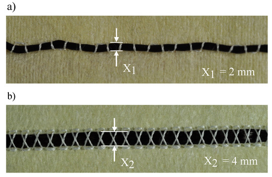 The main focus of the manufacturing process was laid on the attachment of the HE and its corresponding conductor on the chosen heat resistant fleece. For high position reproducibility, the tailored fibre placement method was used for fixation of the components [43]. Thereby, the components can be fixed on a substrate material through the looping of the upper and lower threads. This allows arbitrary geometrical lay-down of the components on the substrate material. The corresponding width of the fixed material on the substrate is defined as the lay-down width. Among other parameters, the lay-down width depends on the thread tension of the upper thread and on the selected stitch pattern. The materials to be fixed, required for the functional warming layer, are the HE, conductors and the insulated twin strand. The first tests showed that the HE is tied together at low yarn tension, resulting in a higher manufacturing speed but a lay-down width of only 2 mm, as shown in Figure 8a instead, of the original width of 7–7.2 mm. With regard to the heat distribution of the HE, a reduction in the lay-down width would result in excessive temperatures, since the heat dissipation of the HE takes place over a smaller area. To prevent this and to ensure that the heat is discharged over a wider area, the cross stitch is applied. Due to the changed stitch pattern, its geometry in combination with an increased thread tension increased the lay-down width of the HE from the original width of 2 mm up to 4 mm, as shown in Figure 8b. The lower manufacturing speed is tolerated in favour of the reduced waviness and maximised lay-down width.