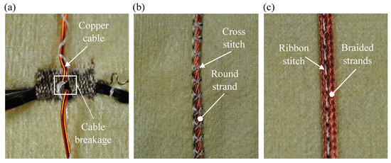 (a) Damaged copper cable; (b) copper strand fixed by cross stitch; and (c) copper braided strand fixed by ribbon stitch.