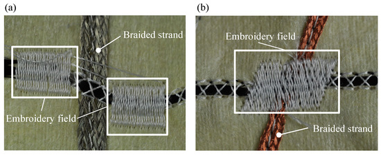 Besides the process of contacting the HE via crimping, where a ferrule is attached on both ends of each heating element using crimping pliers, alternative methods of contacting the HE were tested. To find a way to reduce manufacturing time, increase flexibility of the function-integrative sleeve and improve the adaptability of the sleeve to the upper extremity of the patient. First attempts of contacting the HE with conductive epoxy were not satisfying as the low elasticity of the used adhesive led to a failure of the adhesive bond after several times of adjusting the sleeve to the arm. Consequently, an alternative method was investigated by integrating the contacting process into the manufacturing process of the warming layer. Throughout the first test, embroidery fields were positioned on both sides of the contact point, as shown in Figure 10a, to apply a contact force. Resistance measurements showed that the applied contact force of the embroidery fields is not sufficient to significantly increase the contact area between the conductors. In fact, a low contact resistance () could not be achieved with the lateral positioning of the embroidery fields. In the next step, the embroidery field is positioned directly on the contact point as shown in Figure 10b. Compared to the lateral embroidery fields, a significant reduction in was achieved. Consequently, the central positioning of the embroidery fields above the contact point was used for further investigations.