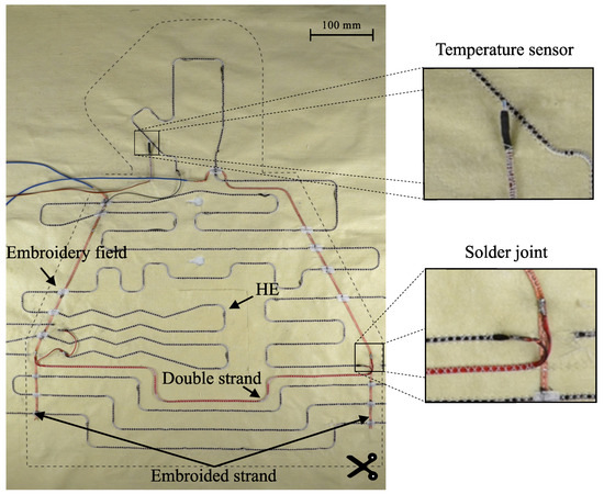 The results show that Combinations 3 and 4 comprising textile contacting have a lower compared to the crimp method. The lowest was achieved in Combination 3, using electrically conductive upper thread material. However, when the silver-plated thread-material is used, there is an increased tearing of the upper thread in the embroidery process. This effect is attributed to the increased surface roughness of the silver-plated thread. The increasing friction force between the thread and the thread-guide of the machine results in an excessive thread-tension and ultimately leads to the tearing of the thread. For this reason, Combination 4 was selected for the production of the function-integrative warming layer. The slightly higher is tolerated in favour of the higher process reliability. Subsequently the functional warming layer was manufactured as shown in Figure 11. Due to geometrical restrictions caused by the cut outs for the blood sample pocket and the sensor probes, three HE could not be connected directly to both conductors. Thus, one end of each of these three HE was crimped and contacted with additional cables by soldering.