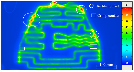 The functionality of the HE was confirmed as shown from the local increase in temperature on the surface of the contact layer in Figure 13. Figure 13 shows that an excessive increase in temperature is measured at the marked textile contact points of the HE. These “hotspots” are due to an increased electrical resistance of the textile contacting point between HE and braided strand. In contrast, no increased temperature values were measured in the area of crimp contacting. The resistance measurements carried out in Section 4.2, however, yielded lower electrical resistance values for textile contacting compared to crimp contacting. A possible influencing factor on the value of the could be the degree of surface oxidation of the copper strands, which subsequently contributes to an increase in the impurity layer resistance. Furthermore, it is assumed that a frequent application of the sleeve and the associated stress, results in a reduced thread tension of the textile bond. The reduced contact force leads to a decrease in the conductivity of the contact point and thus to an increase in . With regard to the patient’s safety, uniform temperature distribution is a decisive criterion that must be met by the heating system. Therefore, actions have to be taken to increase the conductivity and the robustness of the contact areas. One possible measure to counteract the increase in is the use of a silver-containing two-component adhesive in the area of the contact point. In addition, the use of conductive upper thread material could further reduce the . Due to the arising difficulties during manufacturing described in Section 4.2, an adaptation of the manufacturing process would be necessary. The effectiveness of these measures could be investigated within the framework of future optimisation approaches of the sleeve.