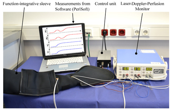 For the function test of the sleeve with regard to adjustment of the BFP, a measurement of the blood flow was carried out on a test person using the prototype. A a clinical study proving the functionality of the presented prototype is subject of future investigations comprising patients with various physical conditions. A preliminary test on a healthy 25-year-old male without vasomotor dysfunction in diabetes or other disease was conducted to give a first feedback regarding the adjustment of the targeted physiological conditions. The measurement setup is shown in Figure 15.