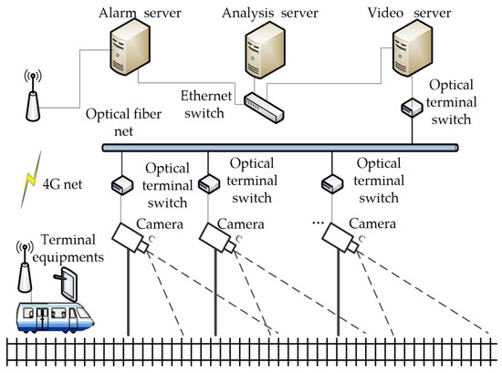 Depending on the detecting principle, railway intrusion detection systems can be divided into two categories: the contact type and the non-contact type. A representative of the contact type is the protective metal net installed along the line to block an object from intruding into the clearance, and the system will send the alarm information when the physical deformation of the net is measured by a dual-power sensor [2] or fiber grating sensor [3,4]. The systems based on the non-contact measurement technology use infrared sensor [5] or laser scanner [6,7] to get the size and location of the intruding object [8]. Video surveillance is also widely used as another kind of non-contact intrusion detection systems because of the large monitoring area, convenient installation, maintenance, and good observable results [9]. As shown in Figure 1, we established an intrusion detection system for the Shanghai–Hangzhou high-speed railway in China. The system contains data process servers, communication networks, and 1550 cameras, including both of fixed and PTZ cameras.