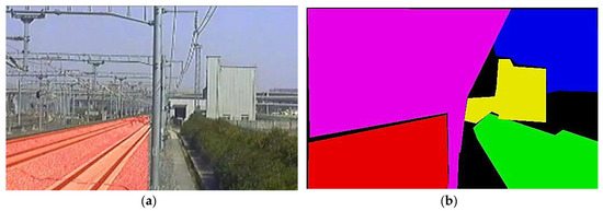 Railway scene and the local areas, labeled manually. The image quality is susceptible to external influences, such as the illumination, weather, and even the dust on the lens. (a) The red area is the track area to be surveilled. The track area includes the rails, sleepers, subgrades, or high-speed railway slabs. (b) Labeling the different area of the railway scene with different colors by manual, including track area (red), sky (blue), catenary system (purple), green belt (green), and ancillary buildings (yellow). The precision depends on the patience of the manual operator.