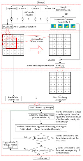 Figure 3 illustrates the outline of the proposed algorithm. We first calculate the feature distribution in a small image patch (pixel size ) representing the central pixel of the patch, then evaluate the central pixel’s probability of being a boundary point, and finally use the boundary weights to segment the image according to a fast combination rule. Unlike the traditional method, we use a smaller set of adaptive Gaussian kernels to extract the pixel color (PC) distribution and pixel similarity (PS) distribution of the image in different channels C and by different scales S. The Gaussian kernels are rotated by a set of adaptive s, calculated from Hough transformation. The detailed procedure of boundary weight generation is described in the remainder of this section.