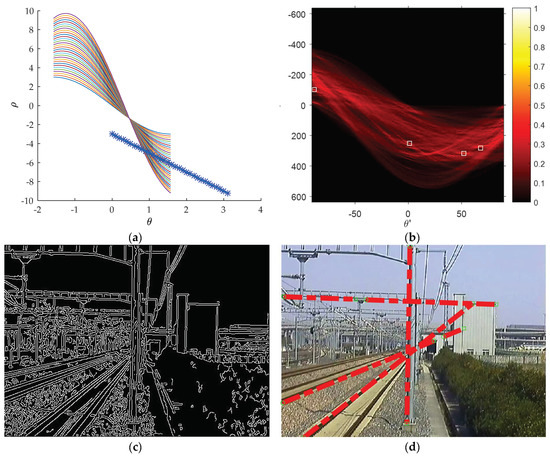 As shown in Figure 4a, each curve in the Hough coordinate system stands for one point in the Cartesian coordinate system. If the curves (colorful curve lines in Figure 4a) have one intersection point in the Hough coordinate system, then the corresponding points (blue point in Figure 4a) in the Cartesian coordinate system are collinear.