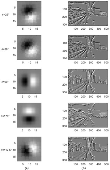 To find a small set of four orientation angles, one can take the top four maximum in , e.g., the points with highest ‘lightness’ in Figure 4b: 68°, 52°, 0° and −88°. Here we change the 22°, 38°, 90°, and 178° in order to obtain a range of values from 0° to 180° (0–). Based on the selected set of orientation angles, the Gaussian kernels can be constructed correspondingly by rotating the Gaussian. As shown in Figure 5, in the Cartesian coordinate system X-O-Y, point rotates around the point an angle to , which can be formulated as