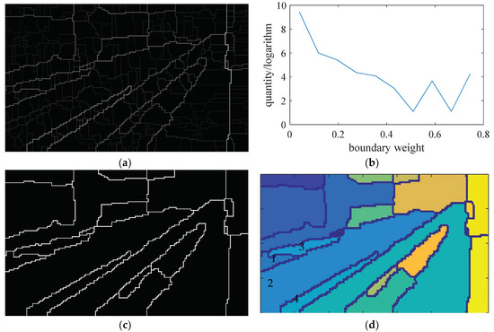 The fragmented regions generated by the adaptive boundary detection are shown in Figure 7a. The higher the boundary weight is, the brighter the point is shown in the gray feature map, indicating that the point is more likely to become a boundary point.