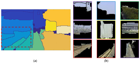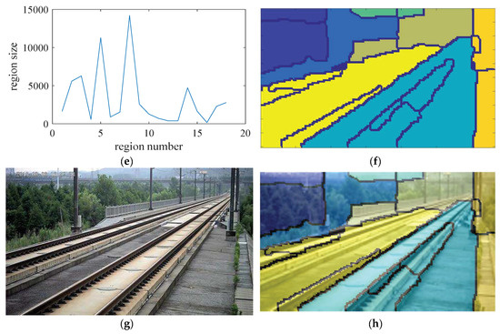 Figure 7g is the original railway scene image, and the Figure 7h is the result of our segmentation algorithm. The railway scene only contains five categories of areas, and the shape of the area is usually in a large and radial pattern. Therefore, we set the minimum area threshold S to 10% of the whole image and the maximum quantity threshold Q to 10, which will prevent the remained regions from being too fragmented. The remained regions will be adjusted into a standard size of 64 × 64 and RGB 3 channels, after being classified by the CNN in Section 4, the remaining regions with the same labels will be combined as one local area.