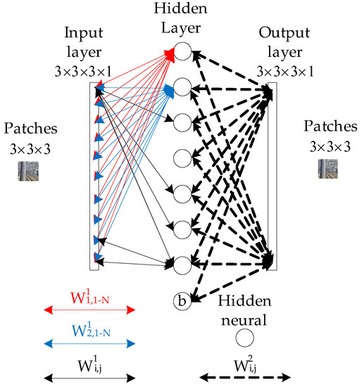 Structure of the autoencoder-decoder network. The hidden layer contains 70 hidden neurons; W denotes the weight associated with the connection between neurons; and the network is trained to produce output the same as its input.