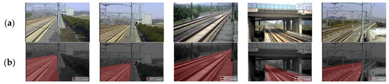 Samples in railway dataset. (a) Images from PTZ cameras under different conditions. (b) Ground truth of the track area.