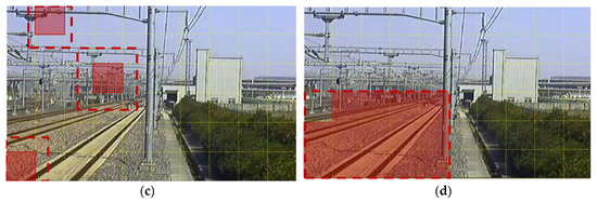 For cameras on line sections, track area only takes up a small portion of the scene image, while for the ones at tunnel entrances and bridges over railway line, track area usually takes up most of the scene. As shown in Figure 12b, the red track area takes about 25–70% of the whole scene image for different cameras. That means, the complete-processing workflow (Section 3 and Section 4) would waste a lot of time calculating the boundaries between the ‘others’ areas (Figure 13b) rather than focusing on the potential track area as the red dotted line rectangle shown in Figure 13a. In order to find the potential track area and reduce the segmentation calculation furthermore, we design a partial-scanning workflow to locate the potential position of the track area before the segmentation and classification by scanning over the railway scene roughly using the proposed CNN. As shown in Figure 13c, we firstly divide the railway scene image into cells (yellow cell); each cell and its peripheral zone (red dotted line rectangle) are resized to pixels, define their classified labels as the representation of its central cell (red area in Figure 13c); the proposed CNN is used to classify these cells and the output labels are used to identify the potential track area roughly as the red area shown in Figure 13d; A minimum enclosing dotted line rectangle is used to adjust the potential track area into a regular shape as shown in Figure 13d.