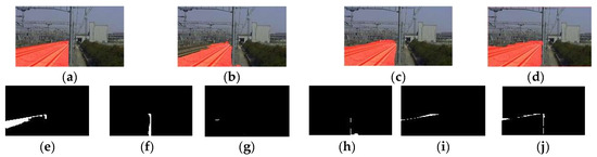 The strategy of the partial-scanning workflow reduces the segmentation area, but spends extra scanning time. Thus, the overall processing time depends on the proportion of the track area to the railway scene, as shown in Table 3, the numbers on the left are the scene images in Figure 12, from the left to the right. If the track area takes over more than 88.1% of the railway scene, the performance of the partial-scanning workflow would be worse than the complete-processing workflow. These two workflows can be chosen for different cameras: for those with short focus lens and focus on the near scene full of track area, the complete-processing workflow should be used; for the ones with long focus lens and track area only take a small part of the scene, the partial-scanning workflow should be used.