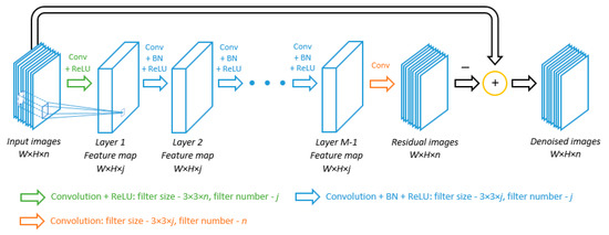 Similar to previous CNN denoising models [28,29,30,31], we also adopt a residual learning [41] strategy by training a residual mapping that maps the noisy images to noise components. The clean images can then be obtained by subtracting the noise components from the noisy images. Previous research [28] has indicated that residual mapping is not only easier to be optimized but also helps batch normalization in reducing an internal covariate shift. Specifically, the loss function l on the network parameters Θ is defined as: