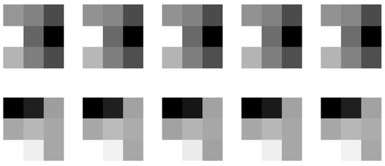 Parameters of the second (top row) and third (bottom row) convolution filters in the first layer (only the first 5 out of 9 matrices are displayed for each 3 × 3 × 9 filter, bright color indicates large values and dark color means small values).