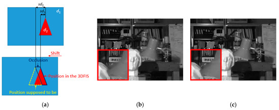 However, in multi-view scenarios, due to parallax, only parts of the input images that are in-focus are actually well-aligned in corresponding Fd, so that the MVCNN model is only able to correctly estimate the noise in these regions. For out-of-focus regions, the noise estimation may not be accurate due to the violation of the alignment rule of MVCNN. Figure 8 shows an example of denoising one of the 3DFIS Fd (d = 5) using MVCNN. The background of the scene has the true disparity 5 and thus will be well-aligned in the input matrix F5. As can be seen from Figure 8d, the network successfully removes the noise in those background regions but fails to correctly estimate the noise in other out-of-focus regions, leaving undesirable blurring artifacts. This issue can be overcome by selecting the appropriate in-focus regions from each 3DFIS using the disparity map in a plane sweeping [38] manner, as discussed in the next paragraph.