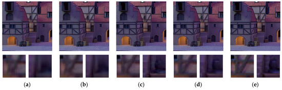 Comparison of single image convolutional neural network (CNN) and multi-view CNN models. (a) Ground truth; (b) Noisy image, PSNR = 20.15 dB; (c) DnCNN [28], PSNR = 29.44 dB; (d) Multi-view image denoising algorithm based on convolutional neural network (MVCNN) (3 views), PSNR = 31.91 dB; (e) MVCNN (9 views), PSNR = 34.68 dB.