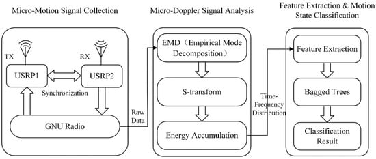 In this paper, we propose a target human motion classification system that can work in the scenarios with non-target micro-motion interference. In the scenarios with non-target micro-motion interference, the proposed system can accurately classify four different human motions, i.e., walking without any arm swinging, walking with one arm swinging, walking with both arms swinging, and running. As shown in Figure 1, the proposed system consists of three parts, as follows: Micro-Motion Signal Collection, Micro-Doppler Signal Analysis, and Feature Extraction and Motion State Classification.